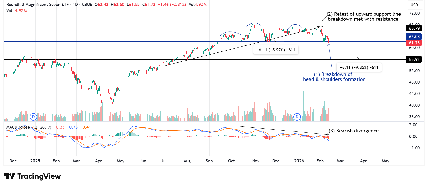 (1) & (2): On 12 February 2026, the Roundhill Magnificent Seven ETF broke down the neckline
