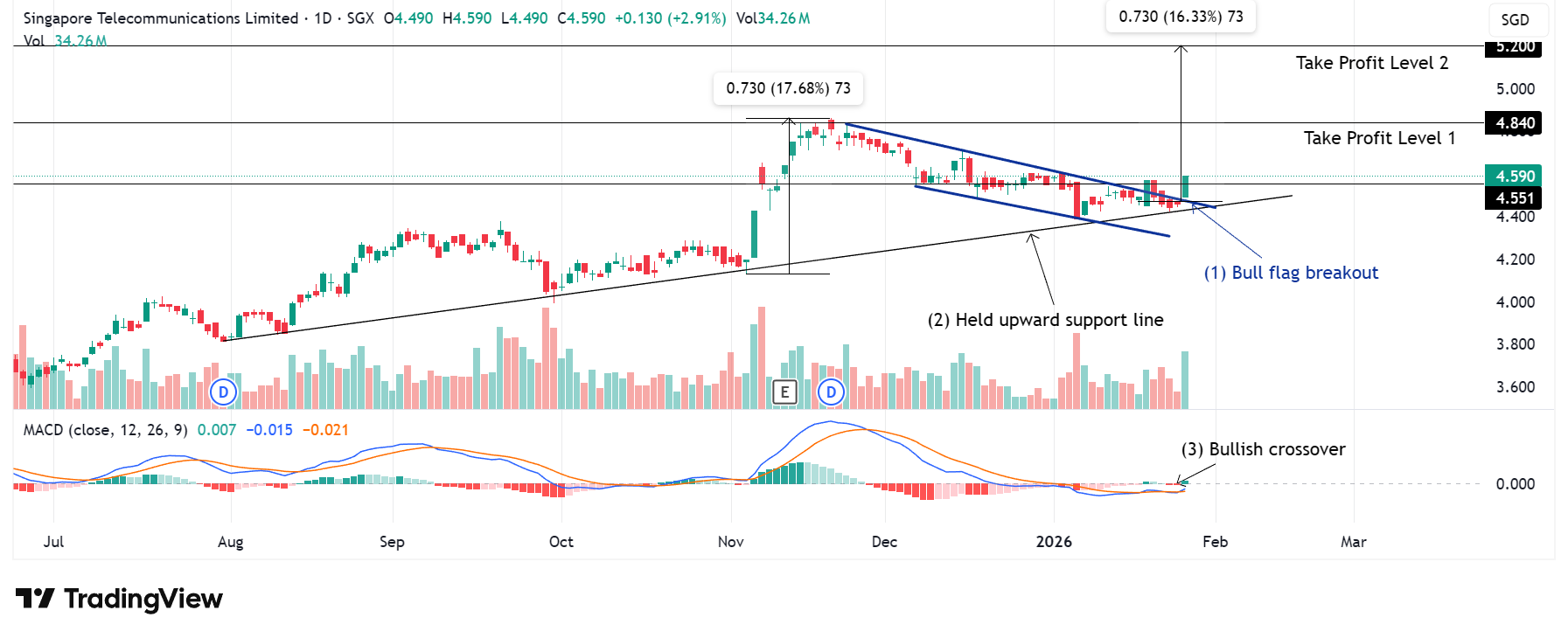 (1) & (2): Singapore Telecommunications Ltd broke out of a bullish flag on 27 January 2026