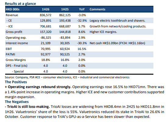 • 1H26 earnings grew from the 2%-point expansion in gross margins, led by growth in the industrial and commercial division. New customers in network infrastructure and PC cooling solutions have led the growth. Network infrastructure products are now the largest category. Revenue declined due to the exit of legacy consumer products.