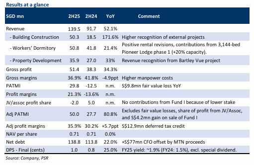 ▪ 2H25 construction revenue spiked 172% YoY to S$50mn. This was driven by higher