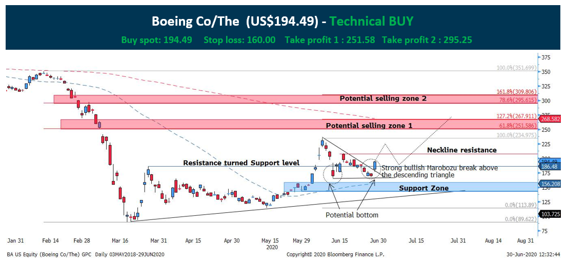 2. The potential double-bottom is a key indication of a renewed bullish upside. Breaking the neckline resistance at US$208.30 will further affirm the rally towards the potential selling zone 1 between US$251.58 – US$267.91.